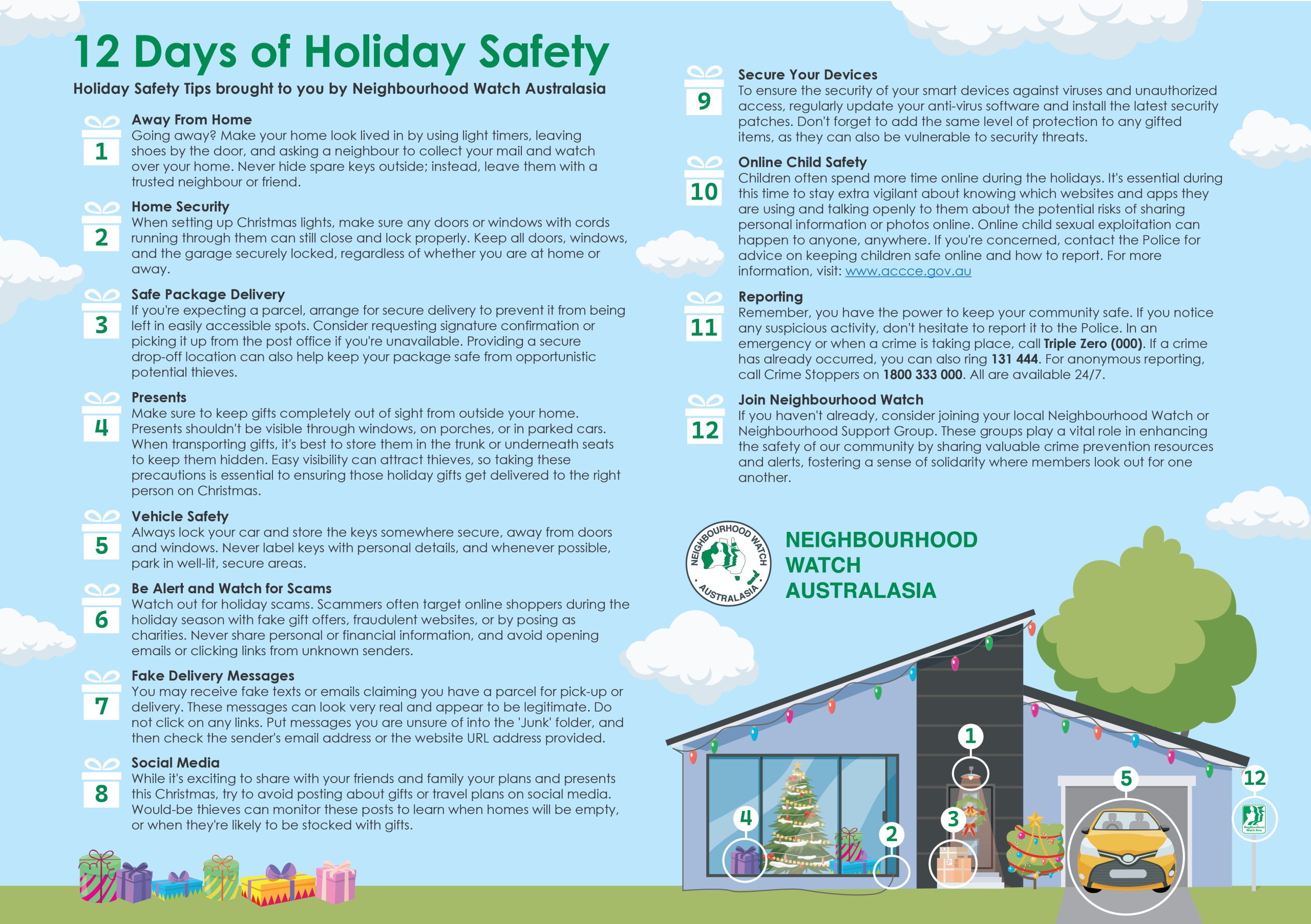 Neighbourhood Watch Australasia brings you 12 useful tips to help keep you, you loved ones, home and community safe these holidays.